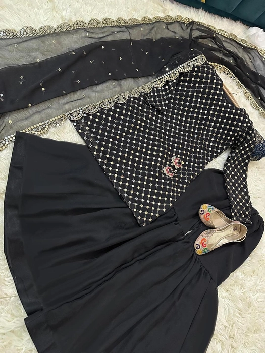 Product Description*: Elevate your wardrobe with this exquisite 3-piece women's stitched set featuring a sequins embroidered chiffon gharara shirt. The elegant black fabric, complemented by a plain trouser, and a beautifully cut work dupatta, makes it perfect for any festive occasion. Step out in style and make a lasting impression with this stylish ensemble.